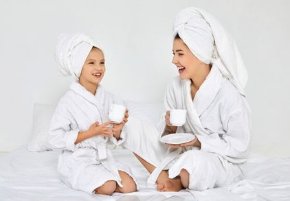 Ritual compartilhado entre mãe e filha, com foco em relaxamento e conexão.